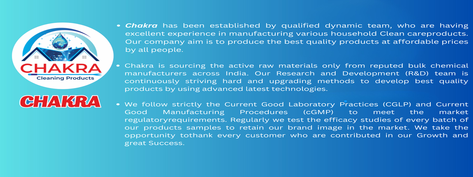 "The quality of Chakra Enterprises’ products is unmatched. The kitchen cleaner works wonders, and I love that it’s safe for my family.It offers the best cleaning solutions I’ve ever used. The bathroom cleaner is fantastic, leaving surfaces sparkling clean."